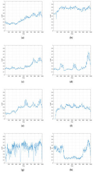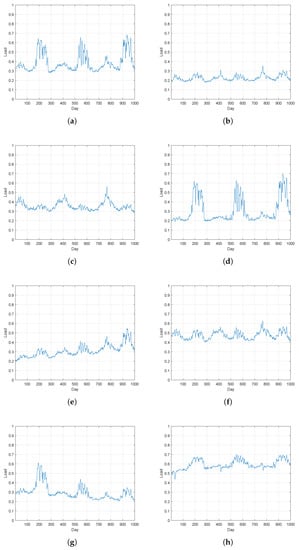 However, as shown in Figure 2, for electricity thieves, most of the patterns have little correlation with the outdoor temperature, and some of them change dramatically. For example, pattern (a), pattern (c), and pattern (d) increase dramatically after day 500. Pattern (b), pattern (g), and pattern (h) are very complex and have little relationship with the outdoor temperature.