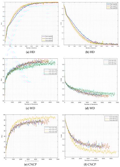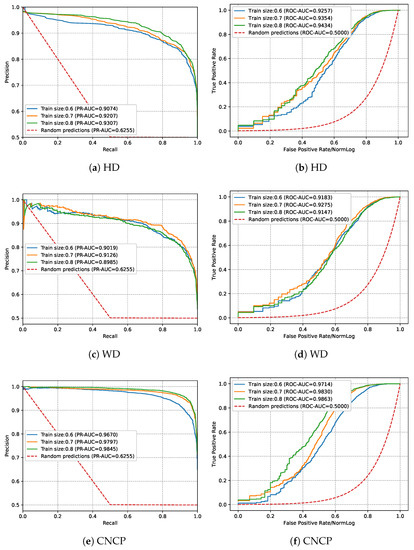 To better demonstrate the performance of the proposed method, in addition to the experiments in the previous section, we carried out extra experiments in which the ratio of the training data set to test data set were 6:4 and 7:3, respectively. The training processes are given in Figure 7, and the results are given in Table 6. We also give the area under the precision–recall curve (PR-AUC) and the area under the receiver operating characteristic curve (ROC-AUC) in Figure 8, as was carried out in [33], to show the relationship between precision and recall, as well as and .