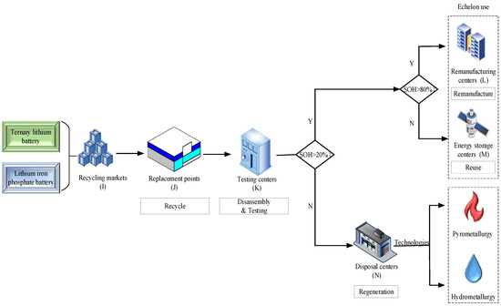 In this paper, the research system boundary covered the process from recovery to recycling WEVBs to reduce costs and carbon emissions. As shown in Figure 1, the network can be divided into five main parts: recycling, disassembling, testing, remanufacturing, recombination, and regeneration, and it consists of recycling markets, battery replacement points, testing centers, remanufacturing centers, energy storage centers, and disposal centers. First, WEVBs are collected from the recycling market through the replacement point and transported to the testing center. The testing center disassembles the WEVBs into battery modules, considers the health status of the WEVBs, and conducts quality-level testing and classification, which mainly include testing parameters such as battery capacity, internal resistance, and self-discharge. Battery State of Health (SOH) reflects the overall performance of the battery and its ability to store electrical energy. Among them, SOH is most commonly defined by the degree of battery capacity decay [54]: