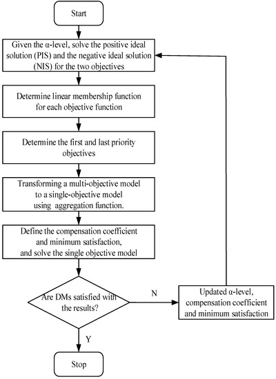 However, their use has some limitations: some may not yield effective solutions or only give a few solutions. Some methods require a two-stage solution or specify a target level, which may be difficult for DM. Therefore, this paper proposes a priority-controlled interactive fuzzy planning approach to compensate for the weaknesses of these methods [53]. Instead of specifying target values for each objective, the model is controlled by weight coefficient and compensation coefficients, using the last priority objective and the constraint of compensation coefficients. With this improvement, the model can produce more effective solutions than existing methods, which is a strength of the method. In addition, the best solution can be easily selected by adjusting the minimum satisfaction level of the last priority objective and compensation coefficient, which is more flexible than the existing methods.