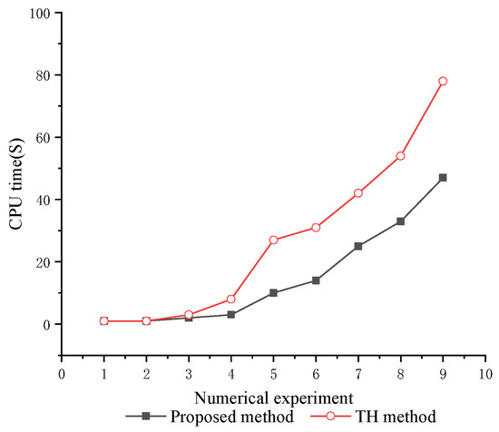 The proposed model was tested on nine different numerical experiment scales. The computation time of the proposed model is shown in Table 11. The CPU times of all the numerical experiments solved using the method of this paper, the TH method, are shown in Figure 8. It can be seen from Figure 8 that the CPU time of both methods changes slightly as the problem size increases. In addition, the results show that the method proposed in this paper outperforms the TH method in this research model and can solve large-scale problems in a reasonable and faster time.
