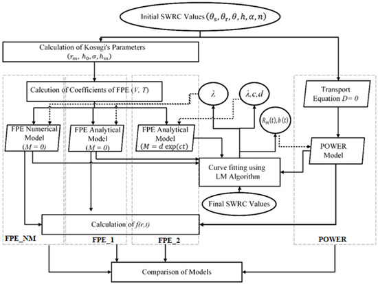 To meet the objective of this study, the following methodology will be followed: (a) formulation of different models for PSD evolution; (b) estimation of Kosugi’s parameters from initial SWRC datasets; (c) determination of coefficients for FPE for analytical and numerical models as well as those of power model; (d) use of the LM algorithm to perform curve-fitting to observed final PSD data to estimate for the FPE_1, FPE_2, and FPE_NM models and to estimate and for the power model; and (e) a comparison of different models over different datasets.