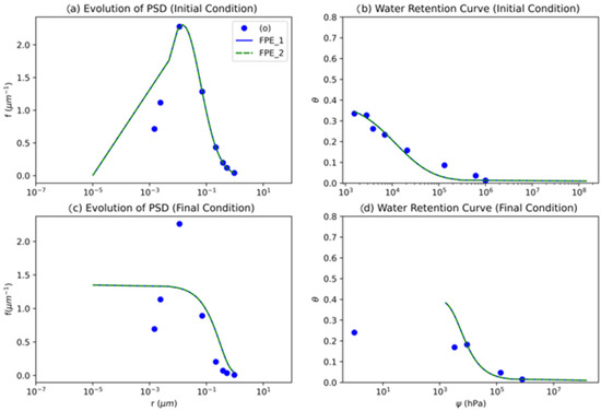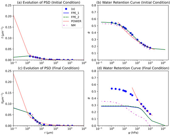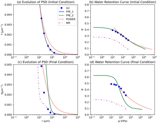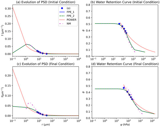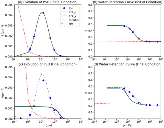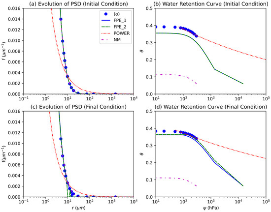 The performance of the models was compared for several more datasets, the results of which are not shown for brevity (see Appendix A). Different models for predicting PSD evolution and SWRC were compared for the German dataset of silty loamy soil [34] (see Figure A3). It was observed that the FPE_1 and FPE_2 models well predicted PSD and SWRC evolution. The PSD and SWRC curves by NM and POWER models were found to be underpredicted and overpredicted, respectively. NM predicted PSD and SWRC with higher accuracy when and the model performance decreases when . POWER model underpredicted the initial soil PSD and SWRC at initial conditions when and overpredicted the final PSD and SWRC when .