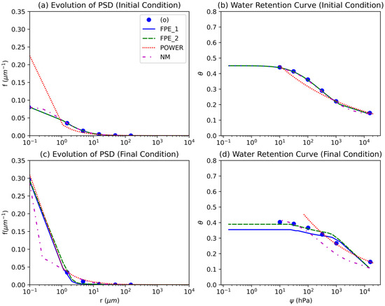 Figure 3 shows the comparison of performances of different models for predicting the evolution of both soil PSD and SWRC against the observed values for Haplic Cambisol soil from the New Zealand dataset [31]. It was observed that all the models performed well except for the NM model, which underpredicted the soil PSD when (see Figure 3a,c). Similarly, for predicting SWRC, the FPE_1 and FPE_2 models performed well despite FPE_1 slightly underpredicting. Both the NM and POWER models slightly underpredicted and overpredicted the final SWRC values, respectively (see Figure 3b,d).
