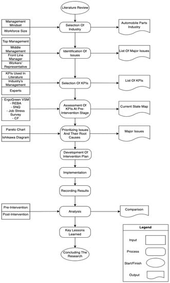 The primary objective of this study is to examine the real-world effects of implementing an integrated framework that combines lean manufacturing, environmental considerations, and ergonomics in the context of the automobile parts manufacturing industry. To evaluate the outcomes, the study utilizes various assessment techniques, including the rapid entire body assessment (REBA) [35] in conjunction with the Standard Nordic Questionnaire (SNQ) to assess ergonomic risks, a job stress survey to measure employee job satisfaction, carbon footprint analysis (CFA) to evaluate environmental impacts [17], and value stream mapping (VSM) to analyze operational efficiency [26,34]. These assessment methods are applied both before and after the intervention phases to gauge the effectiveness of the integrated approach.