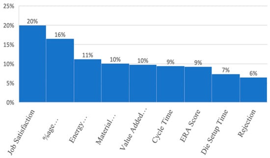 After the identification of issues through SSIs, thematic analysis [44] was used which resulted in the form of word cloud. Based on this analysis, KPIs were selected targeting all problematic areas of the three paradigms (See Table 1). AHP was then used to rank the KPIs. A total of nine participants (members of the quality circle) from the selected industry were chosen for pair-wise comparison utilizing Saaty’s fundamental scale and results were computed using an Excel template [54]. All KPIs are arranged in descending order according to the weights that resulted from AHP and are shown in Figure 3.