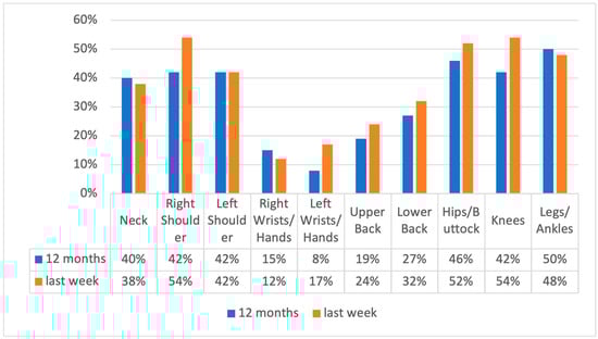 Two key performance indicators (KPIs) were selected for the ergonomics paradigm: the ergonomic risk assessment (ERA) score and job satisfaction. The rapid entire body assessment (REBA) technique was chosen for the ergonomic risk assessment. Before performing REBA, the widely used self-administered Standard Nordic Questionnaire (SNQ) was employed to assess the physical activity levels and musculoskeletal problems experienced by individual workers due to work-related postures. The questionnaire consisted of questions regarding pain, aches, or discomfort in various body parts over the last 12 months in general and the recent week in particular. Figure 4 depicts the survey results graphically, highlighting the major musculoskeletal problems faced by workers.