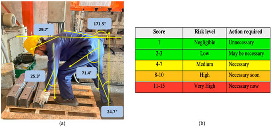 Following the results of the SNQ survey, a posture from each operation was selected for REBA that was causing major issues during the manufacturing of the selected part. An example posture is shown in Figure 5a, where the worker is involved in loading the part from the palette and placing it on the floor. The figure illustrates that the neck is in a 29.7° flexion position, the trunk is bent, the lower limb is twisted, and both legs are asymmetrical. There is flexion in the lower limb as the worker is loading the part in a position where the weight is dominant on the left lower limb. The wrist is in a 15°+ position with an extension in the upper limb. All postures were assessed using REBA scores, as presented in Figure 5b, and a summary of all the REBA evaluation scores is provided in Table 3.