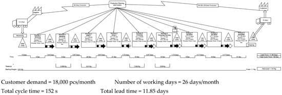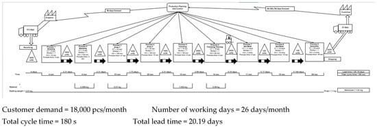 Among these strategies, lean manufacturing (LM), originating from the Toyota Production System, is a widely recognized approach for enhancing an organization’s operational performance by identifying waste and optimizing resource utilization. Key features of lean thinking include just-in-time (JIT) practices, waste reduction, process improvement strategies, defect-free production, and work standardization [4]. Numerous manufacturing processes, spanning from the automotive sector to the service industry, incorporate lean thinking principles into their production strategies to enhance productivity and the quality of their products by reducing costs. Value stream mapping (VSM) is an important lean tool that is utilized to identify wasteful and non-value-added tasks and to prioritize future process improvements [5,6]. The VSM tool captures information related to time, labor force, transportation, and other relevant data, thus, enabling the identification of the desired current state process, the desired future state process, and the associated implementation plans required for future process improvement activities [7].