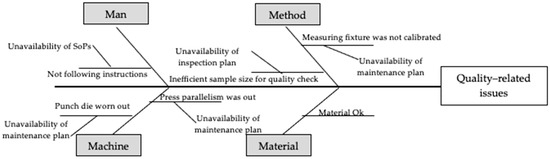A quality circle was utilized to identify the recurring issues related to quality and supply by conducting a root cause analysis with the help of an Ishikawa diagram and 5Why techniques. In the Ishikawa diagram for quality, the team members presented various reasons for rejection, and root causes were categorized into the following: man, machine, material, and method. The analysis revealed that the material was up to the specifications. In the method category, the major cause of rejections was the non-calibrated checking fixtures, which were unable to verify the shape and drawing specifications of the part. Additionally, the sample size for inspection was inadequate, with only 10–5 pcs/lot inspected. The workers were found to not be following the standard operating procedures (SOPs) correctly in the man category, whereas in the machine category, the press parallelism was off, leading to defects in the manufactured parts. Figure 7 depicts the Ishikawa diagram for quality-related issues.