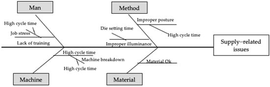 The Ishikawa diagram shows that the absence of a formalized plan, including maintenance, inspection, and SoPs, resulted in quality defects. In terms of supply, the lead time for delivering products to customers was longer than desired, which was impacting the supply efficiency of the industry. The team conducted a root cause analysis for the supply-related issues similar to the approach used for quality issues and identified that repeated changeovers and long die setting time were the main causes of delayed supplies, as shown in Figure 8. These causes were also attributed to a lack of formalized plans and poor ergonomics design.