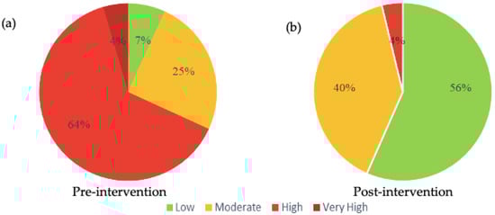 After the implementation of the intervention plan, the REBA scores were recalculated for each process, and the improved results were recorded in Table 9. The table shows that only one process (process no. 8) was reduced to a “low-risk level.” This improvement was attributed to the use of trolleys and work benches during the implementation phase, which resulted in a lower REBA score and reduced risk level. However, it was also observed that the REBA score was not improved as expected due to some work design improvements that required financial capital to change the machinery, making it difficult to implement.