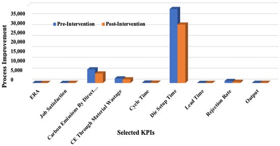 The research findings demonstrate a favorable relationship between ergonomics, green practices, and lean principles concerning performance indicators. Firstly, the study indicates a significant increase in job satisfaction (see Figure 10), indicating that the integrated framework positively influenced the well-being of employees. Furthermore, there was a notable decrease in the REBA score (refer to Table 14), implying an enhancement in ergonomic conditions, improved lighting levels, and a reduction in physical stress experienced by the workers. Consequently, this led to a substantial reduction of 30.3% in carbon emissions, showcasing a positive environmental outcome. This decline in carbon footprint underscores the effectiveness of the go-green aspect of the framework in promoting sustainability. The study also yielded positive outcomes in terms of operational efficiency. It revealed a noteworthy 15.5% reduction in cycle time, indicating improved speed and efficiency in production processes. Moreover, there was a significant decrease of 34.9% in lead time, suggesting enhanced overall process flow and reduced waiting times. Additionally, the study observed a 21% decrease in die setup time, indicating improved operational effectiveness and minimized downtime. Furthermore, the rejection rates, both at the customer end and in-house, exhibited substantial improvements. The rejection rate at the customer end decreased by 45%, signifying enhanced product quality and increased customer satisfaction. Additionally, there was a 32.5% decrease in the in-house rejection rate, indicating improved internal quality control measures and reduced waste. These findings highlight the positive impact of the integrated framework on operational efficiency and quality management.