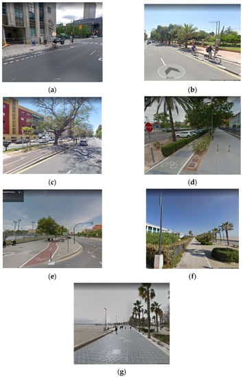 Types of bike lanes: (a) bicycle lane, (b) protected bike lane, (c) sidepath on median, (d) sidepath with vegetated curb, (e) sidepath without curb, (f) bike track, and (g) cycle path [16,17].