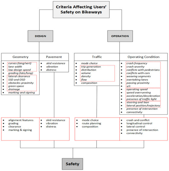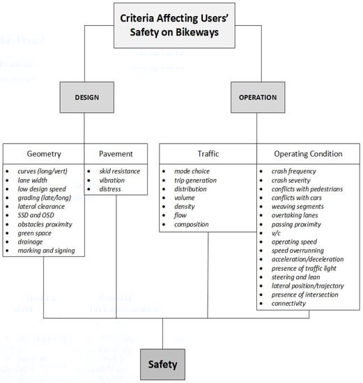 Assuming the homogeneity of fundamental aspects of infrastructures used for motor vehicles and those of the micromobility users, the criteria affecting users’ safety on bikeways were adapted from ASSHTO Green Book 2011 [54]. The relative diagram is demonstrated in Figure 3. This diagram will be the base for further literature synthesis and analysis. These adapted criteria are useful to better filter relative studies to the topic of this research, and to avoid missing any research that may lack sufficient relative keywords to be selected through the scientometric review.