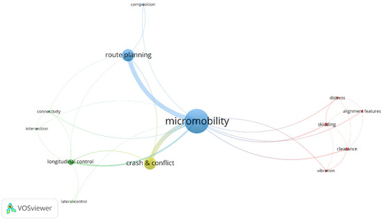 For having a clearer scientometric view of the safety for micromobility infrastructure, another map was developed using only the major four pillars of the adopted map. This map (Figure 6) illustrates how geometry and pavement are overlooked in the literature for improving safety of micromobility users.