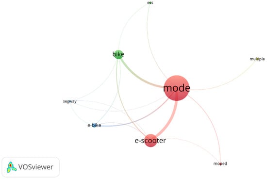 In terms of modes, the cluster analysis map (Figure 7) shows that e-scooters have been the center of attention in the selected studies, with links to four other modes of bike, e-bike, moped, and segway. Next are bikes surrounded by four modes of e-scooter, e-bike, segway, and ESS. E-bike is the third cluster, with three links to bike, e-scooter, and segway. The map clearly shows that there are limited studies that include multiple modes, ESS, segway, and moped.