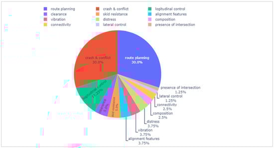 The associated subcategories and criteria for the selected articles were clustered with VOSviewer. Accordingly, from the four main pillars, and their subset 12 criteria, two maps were developed that shows their cluster and interconnection. The visualized map (Figure 5) clearly shows three main cluster groups. Primarily, “route planning” and “crash and conflict” are both equally the largest cluster, that are interconnected and have links to two and one other criteria, respectively. The second cluster is “longitudinal control” with a major link to crash and conflict, and other links to route planning, lateral control, connectivity, and intersection. In the third cluster “skidding” and “clearance” are positioned with three other keywords of alignment features, distress, and vibration centered around them.