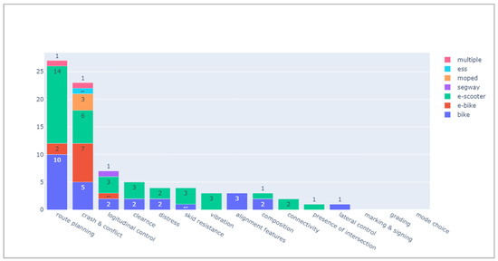 A categorized bar chart (Figure 10) was developed to clearly illustrate the studied mode of micromobility for each area of the research on safe infrastructure. The horizontal axle is divided for each area and shows six different micromobility mode for each criterion, and the vertical axle shows the number of studies existed for each mode. Accordingly, in most criteria groups, there are only one or two modes included in the studies.