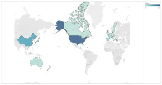 Tableau (version 2022.3) was used to create a cartogram of the studies (Figure 11). The findings demonstrate that US cities were among the largest sampled locations. China was next with 12 studies that was almost half of the samples in USA. After that, Spain, and Italy each have 5 studies sampled their cities, more than France and Denmark with only 3 studies. However, overall, the nine European countries have a large of the literature, with 23 studies that is the same as USA share.