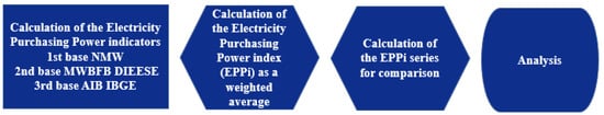 Finally, we developed a set of 3 indicators and an energy purchasing power index. The electricity purchasing power (EPP) was determined as follows: first, based on the national minimum wage (NMW); second, based on the Minimum Wage Basic Food Basket of DIEESE (MWBFBDIEESE); and third, based on the average income of Brazilians, as calculated by IBGE (AIbIBGE). Below, we describe the proposed indicators, which were calculated from 1994 to 2020, except for the EPPAIbIBGE, which was calculated from 2012 to 2020.