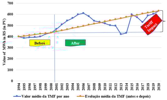 The tariff management process is dynamic and sensitive to periods of crisis, such as inflation, exchange rate policy changes, and water crises, especially the latter, because Brazil’s electricity matrix is highly dependent on hydrological energy generation. In 2021, the Brazilian people faced a triple crisis (inflation, exchange rate, and drought), which has strongly impacted the price of electricity. Considering the increases applied in 2021, the AST/MWh increased approximately 8.00% and is expected to triple in 2022, reaching 27.00% [38].
