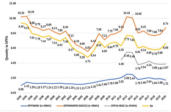 Then, we calculated the EPPi from the of the 3 indicators EPPNMW (MWh), EPPMWBFBDieese (MWh), and EPPAIbIBGE (MWh). Once the of the 3 indicators was obtained, the evolution of the of the indicators was calculated as a percentage with base 100.