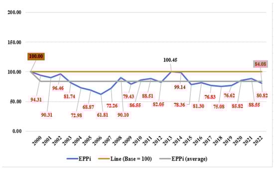 As the EPPi oscillated during the 22 years (20 elapsed and 2 projected years), the average EPPi (weighted average) of the period was calculated to verify the average behavior of the index over time. The result was 84.08%, which confirmed a loss of purchasing power of electric energy from 2000 to 2022.