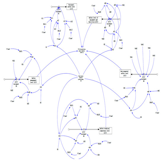 As a theoretical method, the application of system dynamics includes urban economic development, engineering technology, energy planning and many other fields [22,23,24]. Using the system dynamics method to carry out the safety simulation of filling mining mines can systematically and comprehensively analyze the relationship between various factors, study the safety input distribution of each subsystem and put forward corresponding improvement measures and suggestions, so as to reasonably optimize the allocation of resources and continuously improve the safety of filling mining mines.