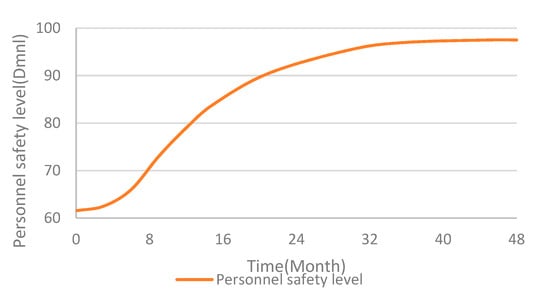 The coal mine safety input parameter value is set to 10, and the SD model is used for simulation. The trend chart and simulation data of the personnel safety level, equipment and facility safety level, safety management level, environmental safety level, safety technical ability level and filling mining mine safety level can be obtained, as shown in Figure 2, Figure 3, Figure 4, Figure 5, Figure 6 and Figure 7. In the figure, “Dmnl” is the abbreviation of dimensionless, which means there is no unit.
