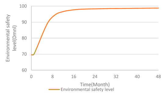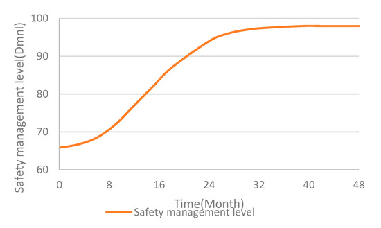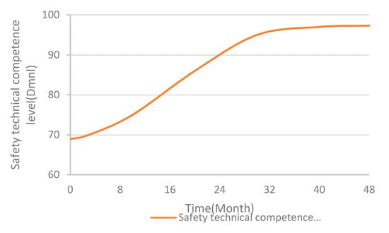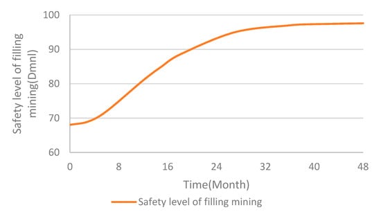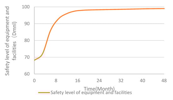 From Figure 2, Figure 3, Figure 4, Figure 5, Figure 6 and Figure 7, it can be seen that the safety level of the filling mining mine and the five level variables all increase with time. In the early stage, the growth rate of the five level variables and the safety level of the filling mining mine is relatively slow, and the growth of the safety level lags behind. This is because the system has a delay, and the safety input has a lag. After the safety investment, it takes time to make the corresponding decision, and the change of the system state also takes time. Therefore, the initial overall growth rate is relatively slow. In the medium term, the growth rate of the five level variables and the safety level of the filling mining mine is faster. This is due to the accumulation of safety investment over time, effective implementation of various safety procedures and the improvement of all aspects of the safety level. Among them, according to the simulation data of level variables, the safety level of equipment and facilities and the environmental safety level reached more than 90 in the ninth month and then gradually approached the limit value. The safety level of personnel, safety management level and safety technical ability level reached more than 90 in the 21st, 22nd and 25ths month, respectively, and then gradually approached the limit value. It can be seen that the improvement effect of the environment and equipment is faster, and the improvement of personnel, management and technology can only achieve initial results after a period of implementation. In the later period, the growth rate of the five level variables and the safety level of the filling mining mine is basically unchanged. At this time, the safety level has reached the expected value, and the safety investment can be appropriately reduced to save resources.