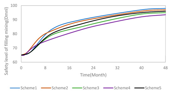 From Figure 8, it can be seen that in the early stage, for the improvement of the safety level of filling mining mines, the improvement rate of Scheme 2 and Scheme 4 is greater than that of other schemes; in terms of the size of the safety level of filling mining mines, the order is Scheme 1 > Scheme 2 > Scheme 5 > Scheme 3 > Scheme 4, but the final safety level of the filling mining mine is not much different.