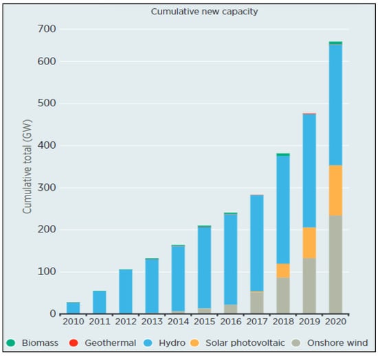 Although hydropower is a mature technology widely used among renewables, IRENA determined that its global share has slowly declined. The percentage of hydropower among renewables fell from 72% of the share in 2010 (881 GW) to 41% of the share in 2020 (1153 GW), excluding pumped hydroelectricity, despite the increase in installed systems [55,56].