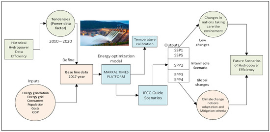 To construct the hydropower scenarios in the face of climate change in Ecuador, we used the historical efficiency of 14 projects, defined 2017 as the baseline year, and projected the IPCC criteria into the possible hydropower trends related to the Shared Socioeconomic Pathways using the Markal TIMES platform.