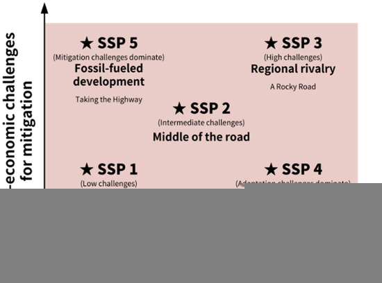 These Shared Socioeconomic Pathways demonstrated possible scenarios that were captured in the IPCC Sixth Assessment Report on climate change in 2021 and describe alternative development pathways in the upcoming decades; for example, it proposed considering the economic evolution, future levels of inequality, and demographic and technological changes, as shown in Figure 3 [32].