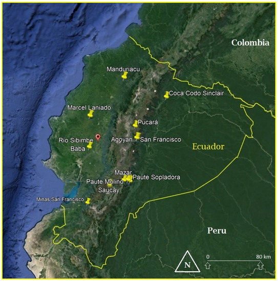 - Open Street Map. Location of Ecuadorian Hydroelectric Plants. 2022. Available online: https://www.openstreetmap.org/note/2721104#map=6/-0.754/-73.334 (accessed on 13 February 2023).