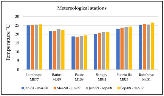 To start the model evaluation in Markal, it compared the observed temperature for the calibration periods; the different colored bars refer to the time period from 1981 to 2017 at six hydrologic stations in Ecuador (Lumbaqui, Baños, Paute, Sangay, Puerto Ila, and Babahoyo) [44]. These meteorological stations are related to the main distribution of hydropower production in the Azuay, Napo, Tungurahua, and Cañar provinces in Ecuador, as represented in Figure 5.