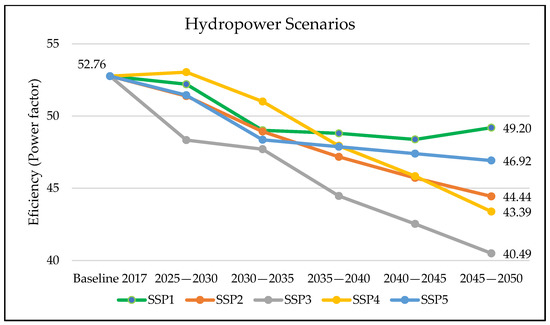 Following the data projection of energy efficiency through to 2050, the main socioeconomic drivers, i.e., population, economic activity, and energy grid, were translated into quantitative scenarios to derive a model of the hydropower power factor of the energy and emissions associated with SSPs, as shown in Figure 7.