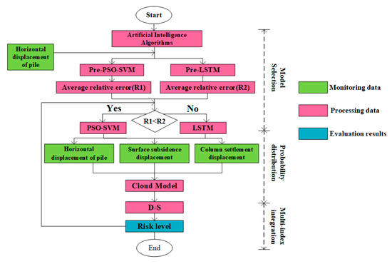 However, a single monitoring index prediction makes it difficult to objectively judge the risk status of the whole pit and verify the accuracy of the classical assessment method. Scholars have proposed a multi-information fusion approach. Wang et al. [13] proposed a multi-source information fusion model based on a T-S neural network to analyze the type of pit prediction alerts. Zhang and Li [14] extracted structural features with the projection tracking method, while dealing with the complexity and uncertainty of foundation pit construction by the SPA methods. Guo and Zhang [15] proposed a hybrid method of BIM and the D-S evidence theory to achieve risk assessment as well as visualization of the tunnel. Zhou et al. [16] proposes a novel risk analysis method combining complex networks and association rule mining, and the proposed method reduces the likelihood of risk occurrence in anomaly monitoring portfolios. Pan et al. [17] proposes an information fusion model with multiple classifiers, which employs support vector machines and Dempster-Shafer evidence theory to assess the health risk of subway structures under uncertainty. It is demonstrated that the fusion model has good robustness. Xia et al. [18] uses LSTM combined with monitoring data and risk evaluation techniques to evaluate the overall safety status of the foundation pit.