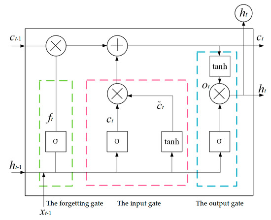 An LSTM model is a special kind of recurrent neural network designed to solve the long-term dependence problem of general recurrent neural networks. This model can not only handle time series data but also implement error correction by backpropagation and gradient descent algorithms. The core of the LSTM model is to design cell states and various gates. The gates are used to add or remove information to the cell state, continuously transmitting the relevant information through a sequence chain for prediction [22]. Its transmission is divided into two processes: (1) forward propagation of the input signal and (2) backward propagation of the error signal. The detailed process is as follows. The basic unit structure of LSTM is shown in Figure 2. The basic unit includes the forgetting gate, the input gate, and the output gate. indicates the increased information, indicates the reduced information.