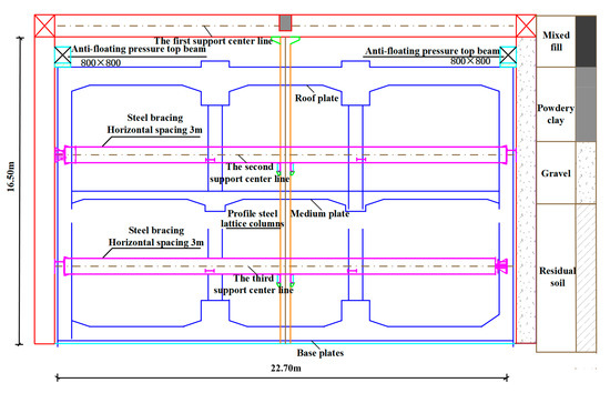 The Martyrs’ Lingyuan Station of Jinnan Metro Line R2 is a two-story underground island station with a reinforced concrete box-type structure. The station platform width is 14 m, and the effective platform length is 120 m. The standard section of the station has a net width of 21.3 m, while the expanded section has a net width of about 24.0~30.6 m. The total outsourced length of the main structure of the station is 331.55 m. The roof cover of the station is about 4.0~6.0 m. The burial depths of the footings of the different sections of the station are as follows: standard section, 18.92~19.64 m; small mileage shield shaft section, 20.6 m; large mileage shield shaft section, 19.94 m; interchange nodes, 25.47 m. The station’s geomorphological unit is a mountain plain with relatively flat terrain. The steel supports are arranged continuously along the longitudinal direction of the pit using double-split I-beams. The geology within the construction area of the station is mainly miscellaneous fill, loess, pulverized clay, gravel, and residual soil. The structure and geological section of the station are shown in Figure 5.