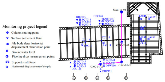 The project location of the monitoring program at Jinan Metro Line R2 Martyrs’ Cemetery Station is shown in Figure 6, including the deep horizontal displacement of the piles, surface settlement, column settlement, etc. These monitoring indicators can directly reflect the safety status of the foundation pit enclosure [28,29]. Therefore, the three monitoring indexes of pile horizontal displacement, surface settlement, and column settlement are used to analyze the safety state of the foundation pit retaining structure in this paper. According to the norms [30,31,32], the daily accumulated deformation and the rate of change in the monitoring data are selected as the judgment indicators, as shown in Table 2. Referring to the control value of the foundation pit supporting structure and the early warning management system in the open excavation method monitoring scheme of Martyrs’ Lingyuan Station of Jinnan Railway Line R2, the determination index is divided into four levels, as shown in Table 3.