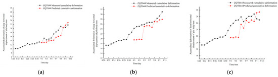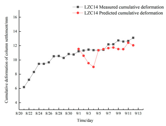 The 30~34 axis of the foundation pit is the layout project of the Martyrs Cemetery Station of Jinan Metro Line R2 in Figure 4. The cumulative deformation of different monitoring indicators is projected, including surface settlement displacement (DBC121), deep horizontal displacement of piles (ZQT044), and column settlement (LZC14). The projected cumulative horizontal deformation of ZQT044 at depths of 12 m, 12.5 m, and 13 m is depicted in Figure 12a–c. According to actual daily monitoring data, ZQT044 is safe from 21 August to 9 September. The rolling prediction was performed, and it was discovered that the cumulative deformation predicted by ZQT044 over the next three days at a depth of 13 m is nearing the control value. The cumulative deformation forecast for surface settlement DBC121 and column settlement LZC14 is not anomalous, as illustrated in Figure 13 and Figure 14.