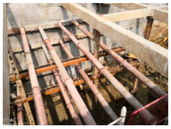 According to the construction log record on September 9, the site personnel set the risk level status of the enclosure structure as Class I safety status, there was no abnormality at the site, and the workers continued to erect the steel support. As shown in Figure 15. This assessment result status is consistent with the multi-indicator fusion result. The accumulated value of horizontal displacement of the pile body is close to the control value alone, which is prone to bias and cannot objectively and accurately determine the comprehensive risk level of the enclosure structure.