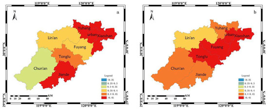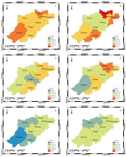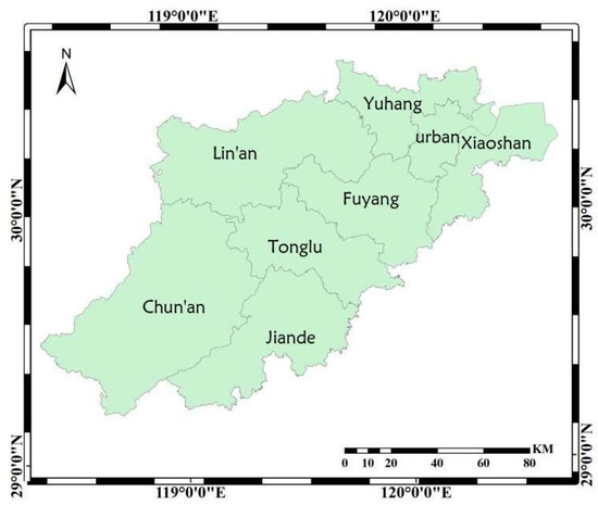 According to the administrative division of Hangzhou in 2018 [27], the study area consists of eight districts and counties: Hangzhou City, Lin’an, Xiaoshan, Yuhang, Fuyang, Tonglu, Chun’an, and Jiande, as shown in Figure 1.