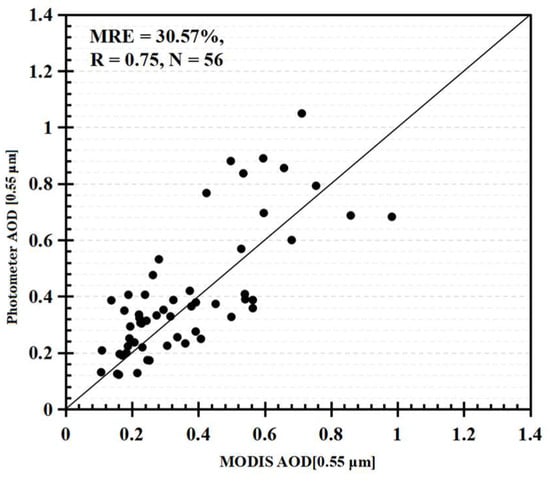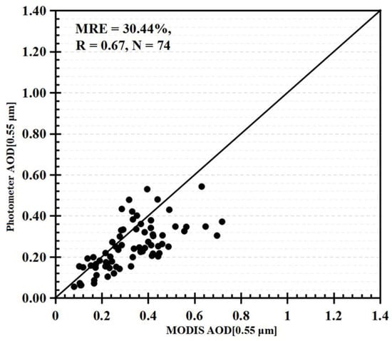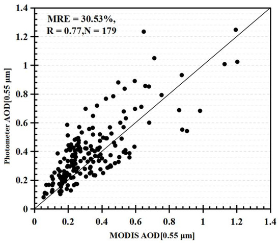 After the photometer data and MODIS data were matched in time and space, a linear fitting analysis was conducted between them. The fitting results were evaluated by the parameters of linear regression, such as slope a, intercept b, correlation coefficient R, and mean relative error (MRE).