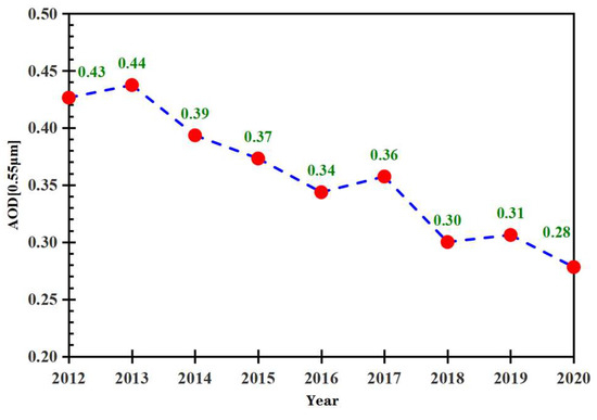 The change in annual AOD values in Hangzhou from 2012 to 2018.