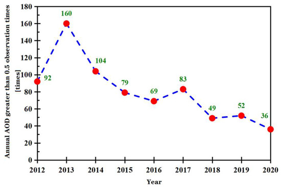 The number of days with AOD values greater than 0.5 was analyzed, and its distribution from 2012 to 2020 was obtained and shown in Figure 8. It can be seen that from 2012 to 2020, the annual days with AOD values greater than 0.5 show an overall downward trend. Specifically, from 92 days in 2012 to 36 days in 2020, there is a decrease of 56 days. However, in terms of annual changes, the number of days with AOD values greater than 0.5 increased in 2013, 2017, and 2019. Especially in 2013, there is an increase of 68 days. This trend is the same as that in Figure 7.