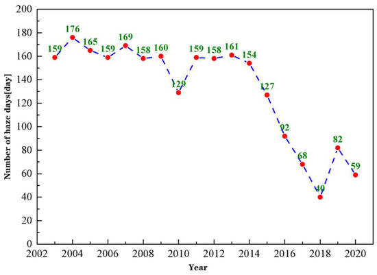 According to the measured atmospheric data provided by the Hangzhou Meteorological Bureau, Figure 9 and Figure 10 are obtained. It can be seen from Figure 9 that the annual haze days in Hangzhou from 2012 to 2020 can be divided into three stages. The first stage is from 2012 to 2014, during which there is almost no significant decrease or increase in the number of annual haze days in Hangzhou, and the annual change is less than 10 days. The second stage is from 2014 to 2018, during which the number of annual haze days in Hangzhou shows a significant downward trend, and the decline in 2016 is the most obvious, i.e., 35 days. The third stage is from 2018 to 2020, during which the number of annual haze days in Hangzhou first increased by 42 days in 2019 and then decreased in 2020. Generally, during the nine years from 2012 to 2020, the number of annual haze days in Hangzhou first fluctuates slightly, then begin to decrease obviously, and finally increases to a certain extent, indicating that the air quality in Hangzhou began to improve continuously in 2014 and began to decrease in 2019.
