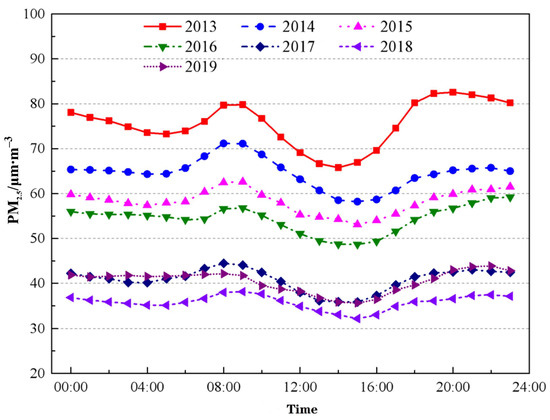 As shown in Figure 10, the change in daily PM2.5 in Hangzhou from 2013 to 2019 indicates that the daily PM2.5 in Hangzhou has an obvious variation trend, with a larger value at 8 o’clock and 20:00 and a smaller value at 14:00. From the change over the years, the average annual PM2.5 in Hangzhou shows a steady downward trend from 2013 to 2018, and the annual PM2.5 increased in 2019. This indicates that the air quality of Hangzhou improved continuously from 2012 to 2018 but decreased in 2019.